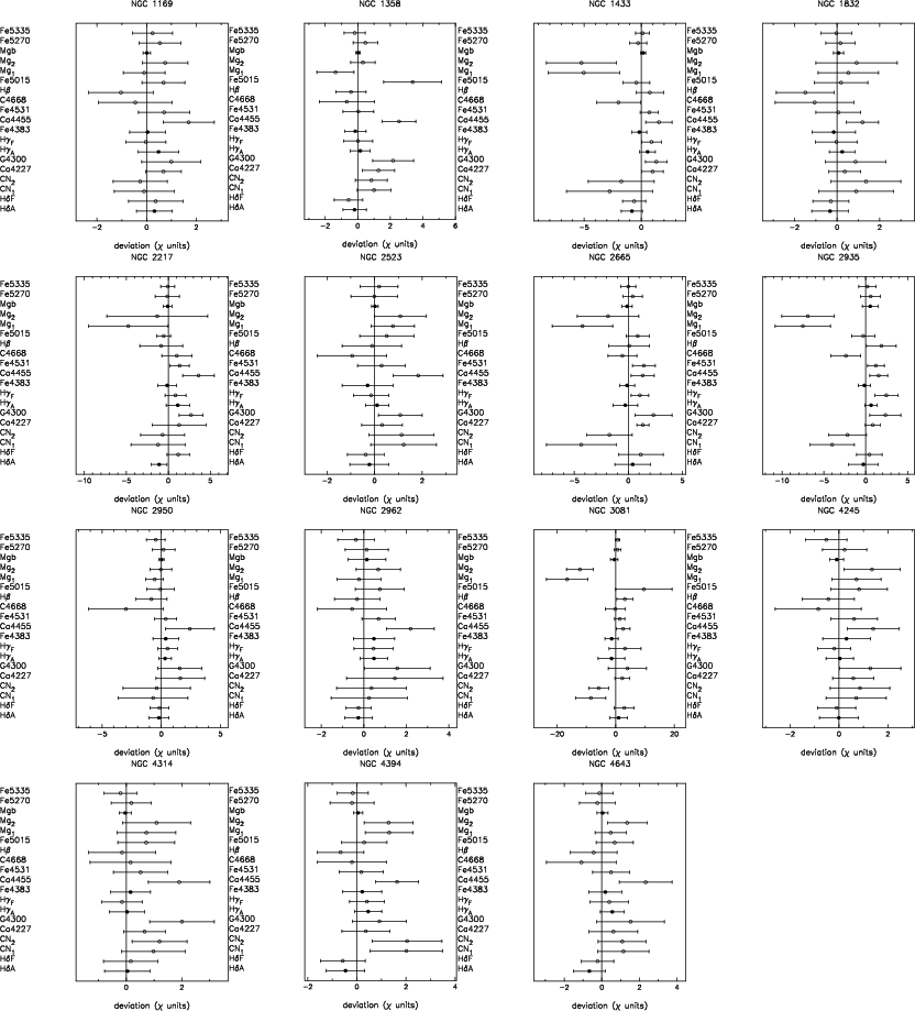 Figure C.1: Deviations from best fit values for data compared to the models of TMB03. The indices that have been used for the fit are represented with filled symbols. |
