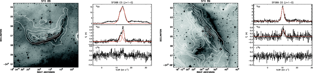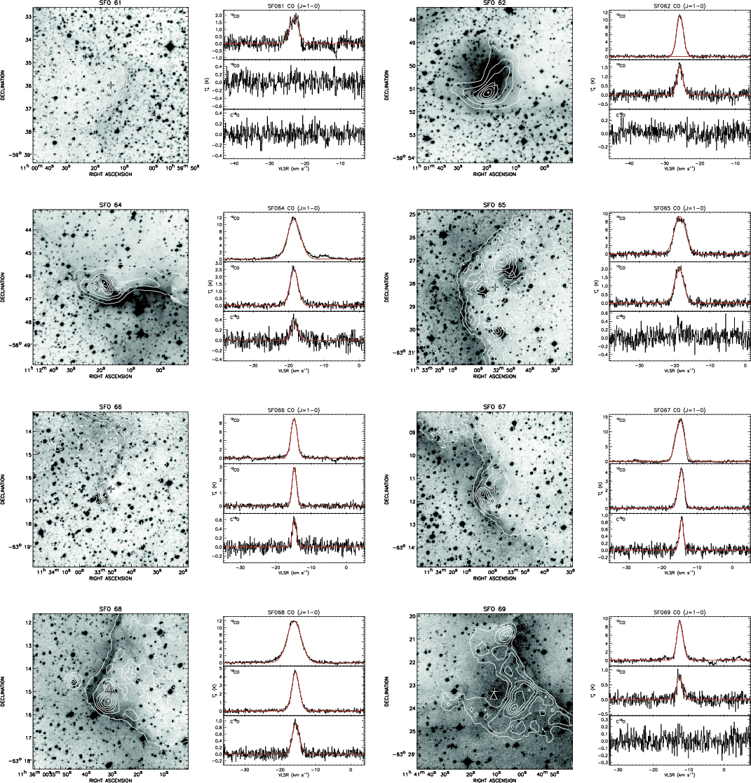 DSS images and CO spectra obtained towards the 42 BRCs towards which emission is detected. The DSS images presented in the left panels are overlaid with contours of the MSX 8 |