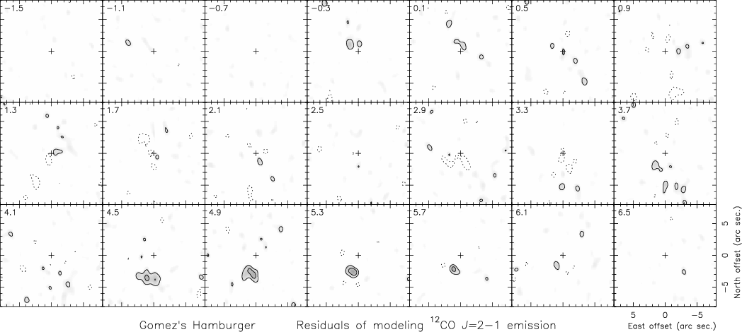 It has been argued that in sources comparable in angular size to the telescope resolution, the comparison performed in the image plane is inaccurate. This is untrue in our case, since GoHam occupies an area about 30 square arcseconds, almost a factor of 20 larger than the beam of our 12CO J = 2-1 data. The cleaning process always introduces noise, but, besides numerical noise, it is mostly due to uncertainties in the calibration of the complex visibilities, i.e., the true beam shape not being exactly equal to the theoretical beam function (for the uv coverage of the observation). Subtraction of the convolved `clean components' and the subsequent convolution to obtain the final image introduces then spurious features, mainly when the uv sampling is poor. However, such unavoidable uncertainties in the amplitude and phase calibration also appear if the fitting is performed in the uv plane, and the limitation in the dynamic range of the observations due to them applies to both the sky plane and the Fourier transformed plane. On the other hand, we also note that Fourier transformation of the predicted brightness (which must be calculated for a finite grid of points in space coordinates from the standard radiative transfer equation) also introduces numerical noise.