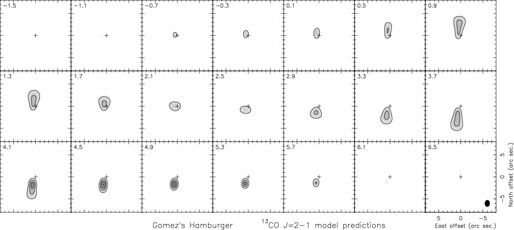 In Fig. A.1, we present the residuals of our fitting of the 12CO J = 2-1 maps. Predictions and residuals for 13CO J = 2-1 are shown in Figs. A.2 and A.3. Except for the velocities around 5 km s-1, the typical rms noise outside the emitting regions is about 0.1-0.11 Jy/beam (slightly less for 13CO J = 2-1), and does not exceed 1.5-1.7 Jy/beam in the regions with emission. We see that the largest residuals in the differential images do not reach two contours (noise reaching one level is also seen out of the emitting regions).