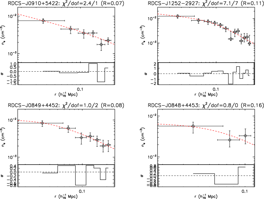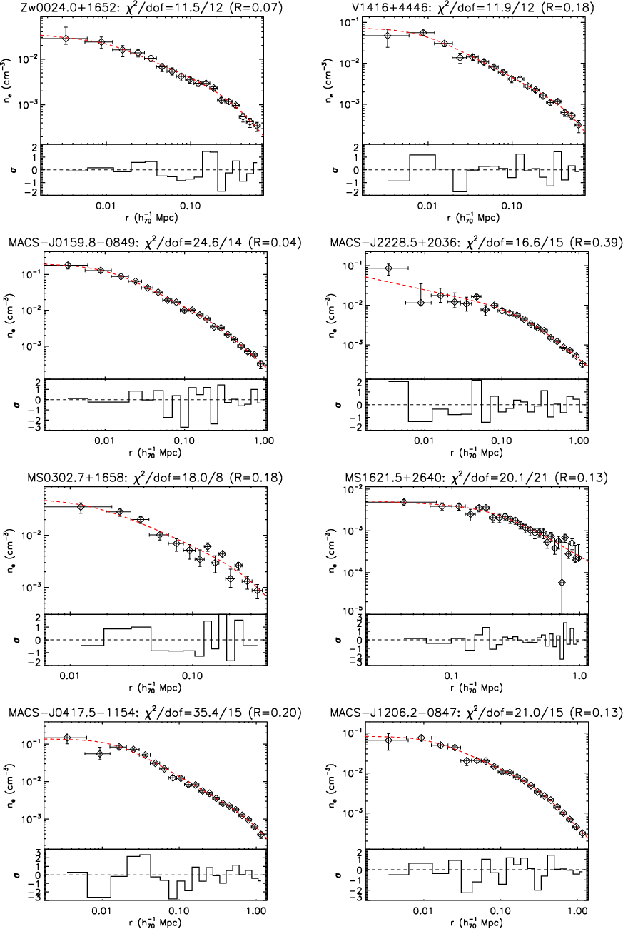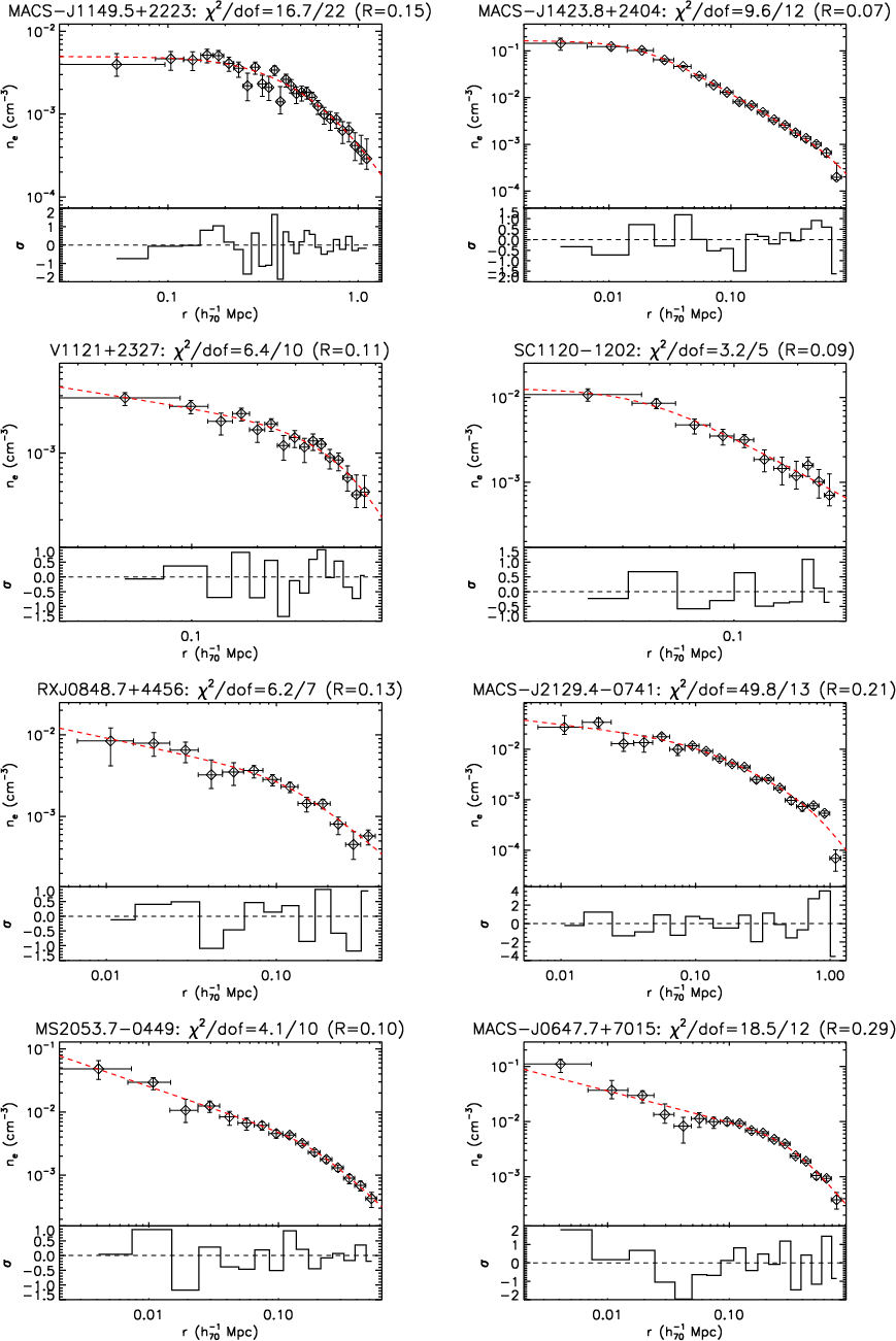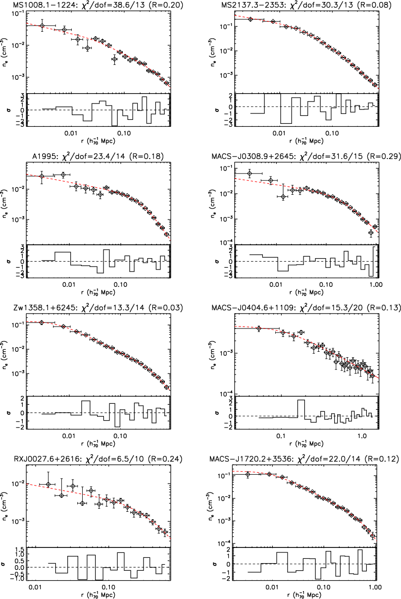 We show the electron density profiles, obtained from the deprojection of the surface brightness, of the objects in our high-z sample. We overplot the best-fitted function form in Eq. (5) fitted over the radial range
