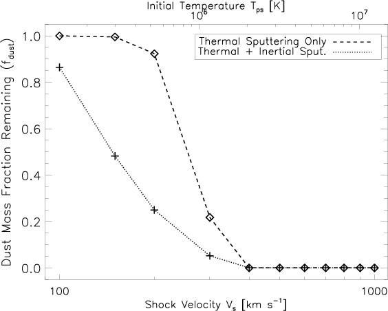 to 104 K as a function of the shock velocity. The dotted line includes both thermal and inertial sputtering. For comparison, the dashed line only includes dust destruction by thermal sputtering. Our calculation for thermal sputtering with a single grain size (