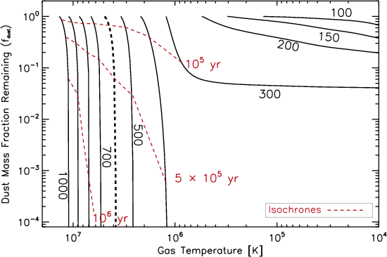 T > 106 K, the dust lifetime is shorter than the gas cooling time and most of the dust is destroyed. At lower temperatures (