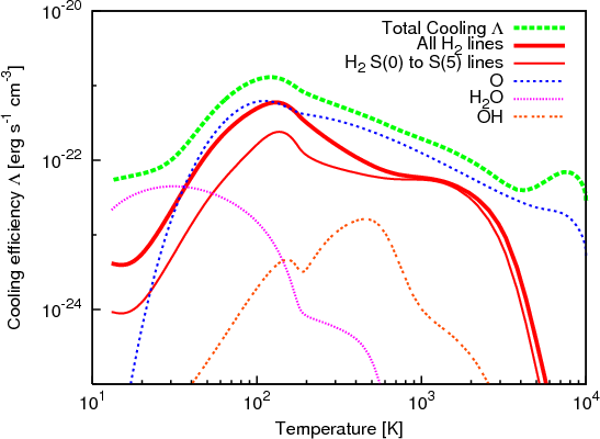 formation is roughly balanced by the cooling due to atomic oxygen (see Fig. 3 in Flower et al. 2003).