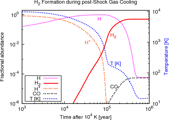 This section describes the cooling of clouds below 104 K and H2 formation. We use the chemistry, and the atomic and molecular cooling functions described in Flower et al. (2003) and references therein. The principal coolants are O, ,