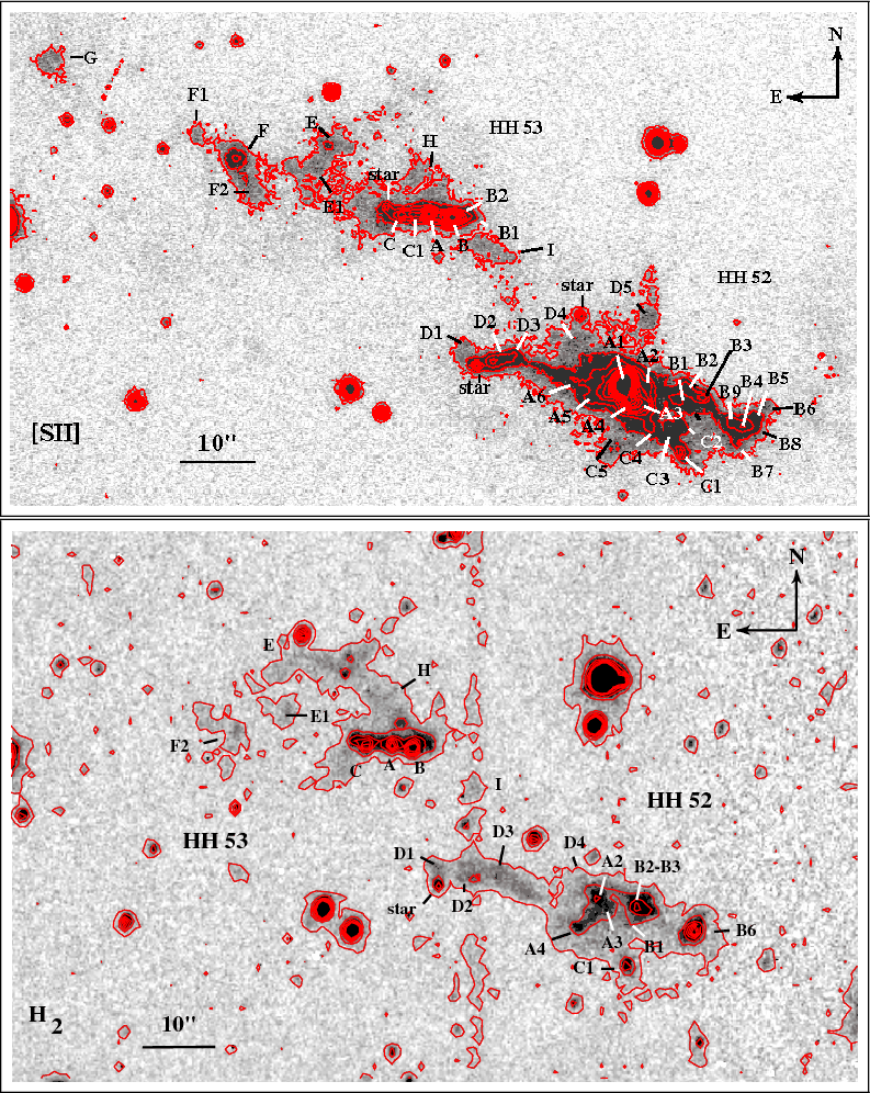 In addition to the three HH 53 knots already known (A-C), we detect several more emissions coming from this region. Three more knots, mainly emitting in the H line (Fig. 4), are found along the main flow, forming an elongated S-shape chain of E-W knots. We label C1 the emission between C and A, and B1 and B2 those close to B. These objects are not detected in our H2 images and two of them (knots C1 and B1) are just barely visible on the [S II] images. More diffuse emission, detected in all three filters, appears superimposed on the HH 53 main flow, connected to the HH 52 streamer. HH 53 I lies SW, towards HH 52, while H and E are situated NE in the opposite direction. Two brighter structures are located farther NE along the streamer. Group F, with a jet-like appearance in the optical filters,