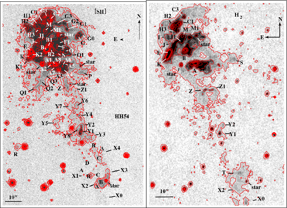 In Figs. 4 (left panel) and A.2 we show the HH 54 images and contours in H,