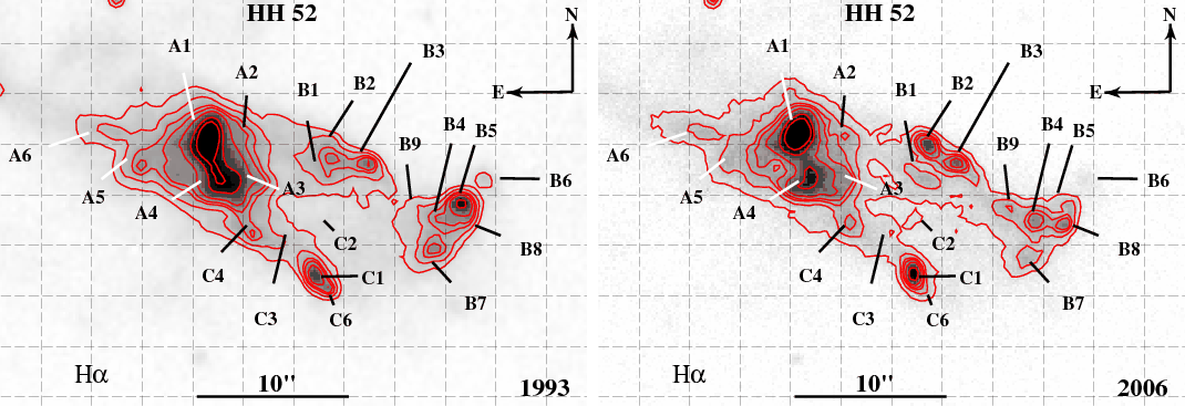 A completely different behaviour is found for the features located on HH 52 wings in the rear of the flow. Although following the bulk of the flow, they show a high degree of variability during the 20 years of observations, as reported in Appendix C. Such a variability, both due to local instabilities inside the flow and fast moving shocks overtaking HH 52 from behind, makes their identification in different epochs and a correct evaluation of the PMs and PAs sometimes difficult (see also Figs. 5 and 6).