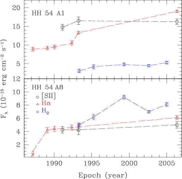 10-15 erg s-1 cm-2 (2005) in H2. On the other hand the measured flux in the three [S II] images is constant.