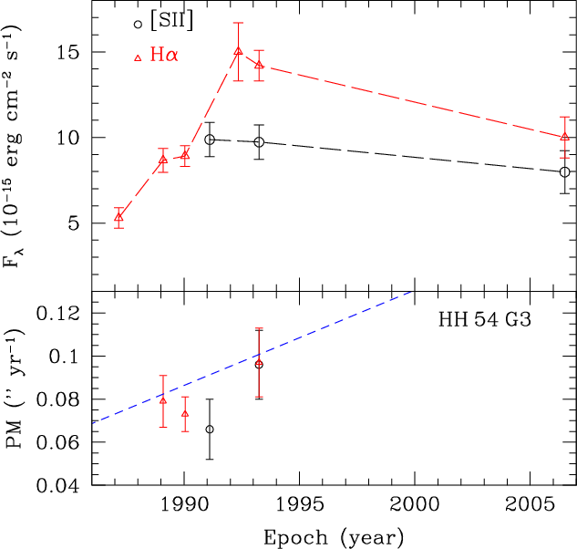 Graham & Hartigan (1988), but the value measured in the middle (considering also the errors) is lower than ours of 10-20 km s-1. Such a difference in their values could be due to a not perfect positioning of the slit, due to the sinuous geometry of the HH 54 streamer.