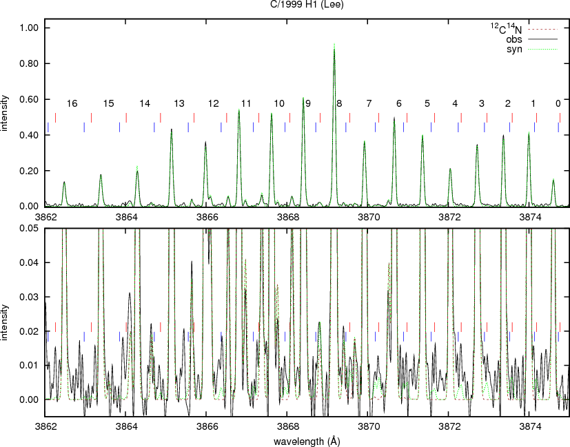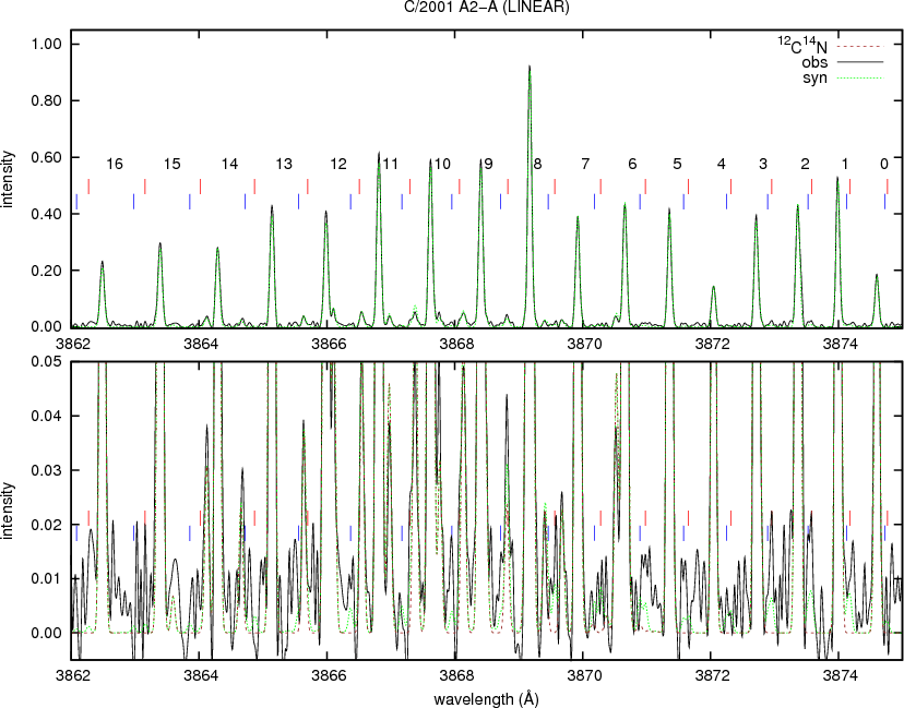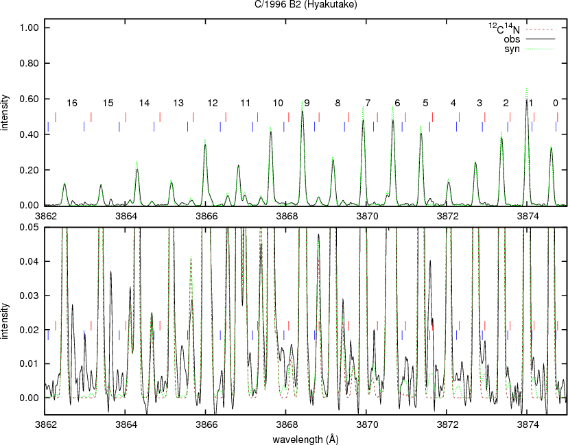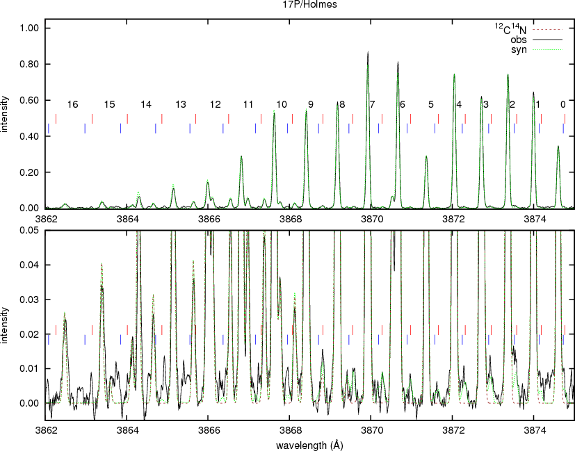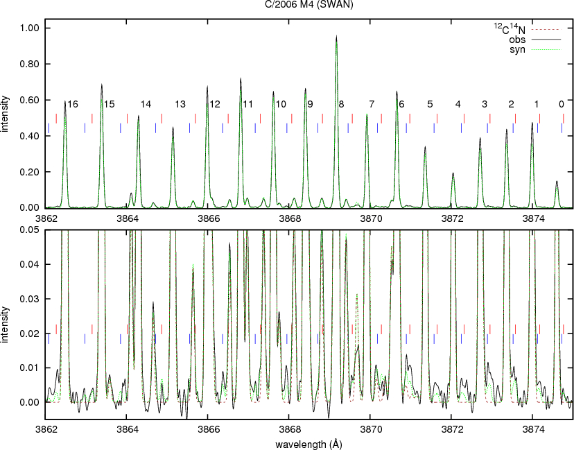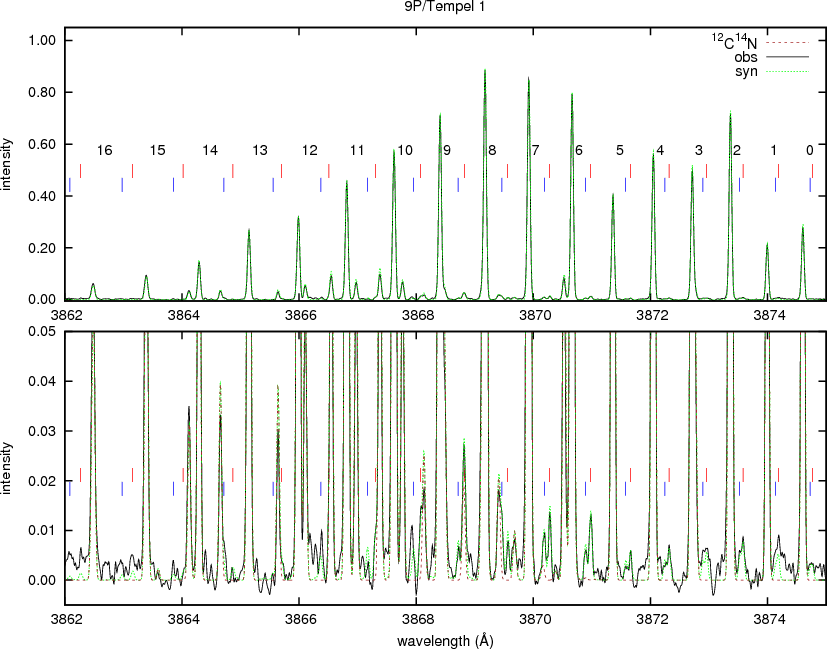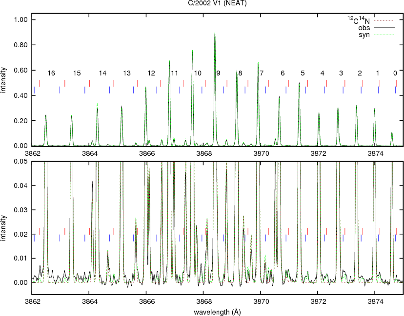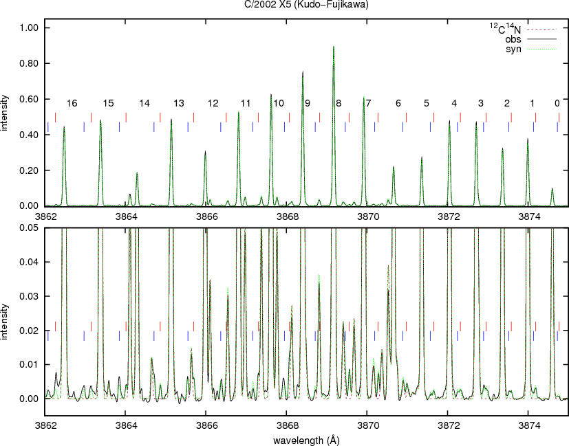 Figure A.1: Coadded observed (solid line) and synthetic (with and without the rare isotopologues) spectra of comet C/2002 X5 (Kudo-Fujikawa). The upper panel is centered on 13C14N lines (in this instance, R1-R6, R14 and R16), the lower one on 12C15N lines (R1-R5, R11-R13, R15-R17). The large number of useable isotopic lines is allowed by the good quality of the spectra used in the combination. Intensity is in arbitrary units. |