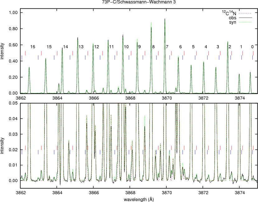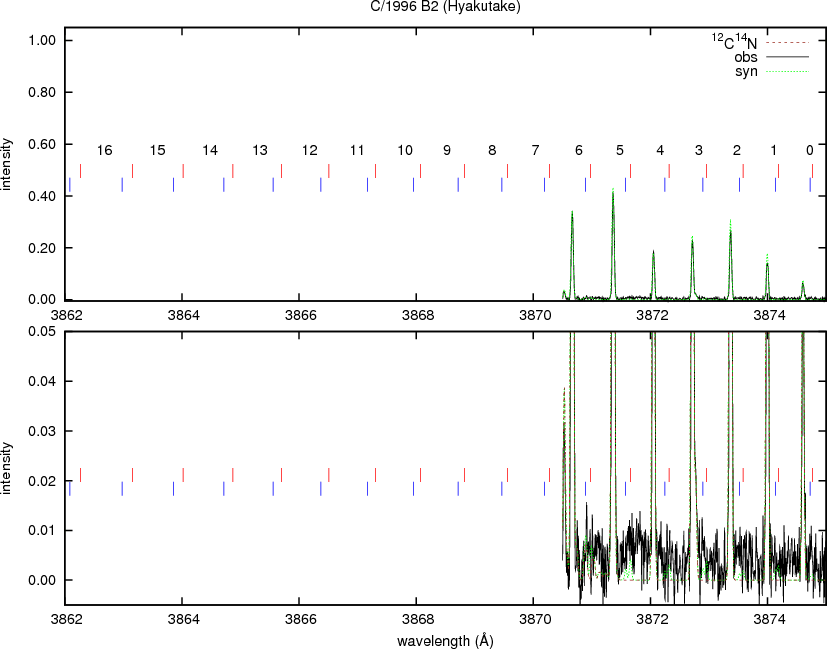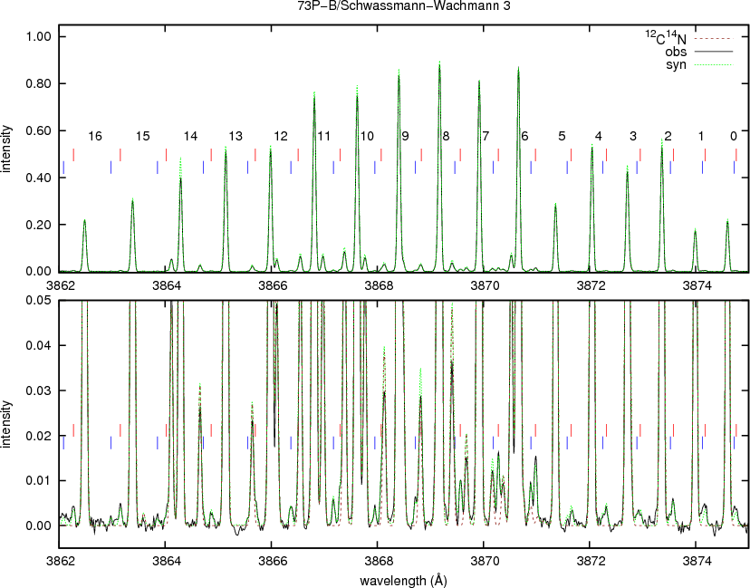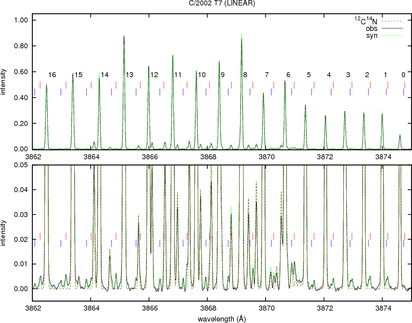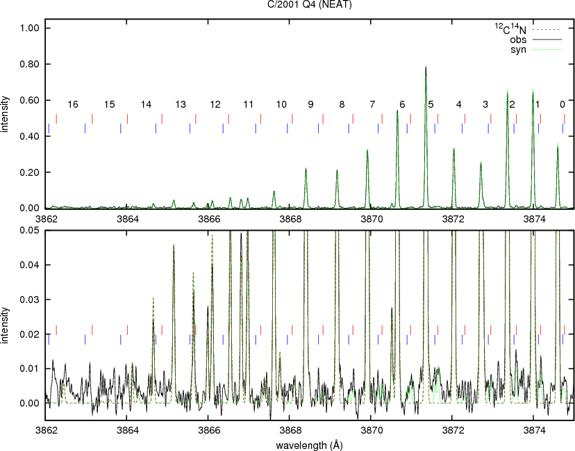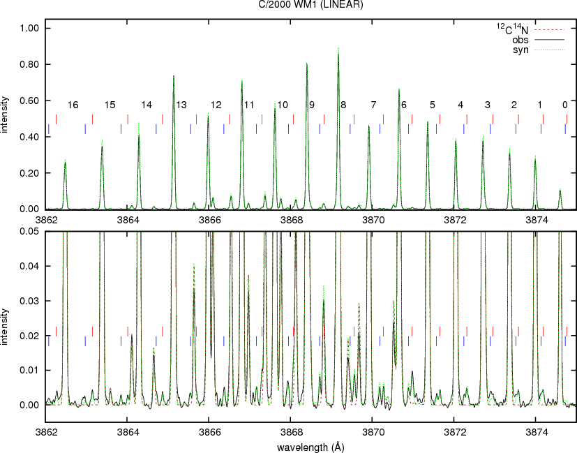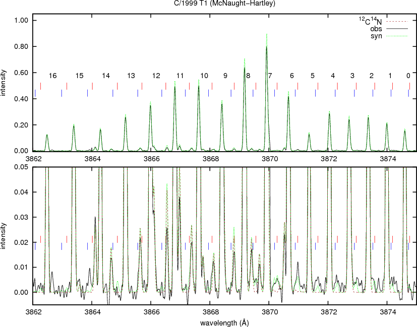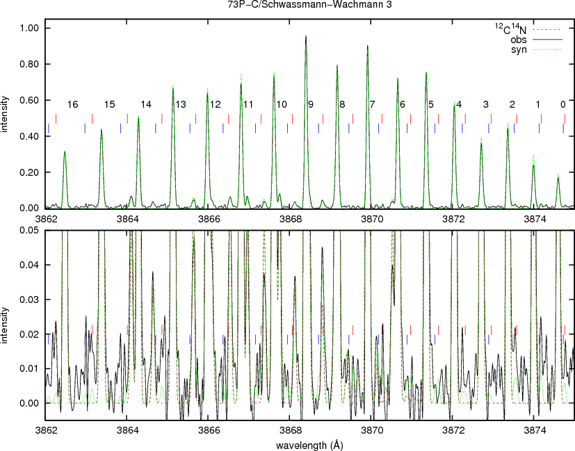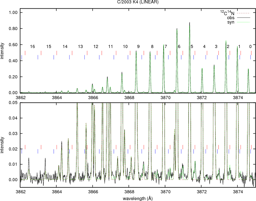 Figure A.1: Coadded observed (solid line) and synthetic (with and without the rare isotopologues) spectra of comet C/2002 X5 (Kudo-Fujikawa). The upper panel is centered on 13C14N lines (in this instance, R1-R6, R14 and R16), the lower one on 12C15N lines (R1-R5, R11-R13, R15-R17). The large number of useable isotopic lines is allowed by the good quality of the spectra used in the combination. Intensity is in arbitrary units. |