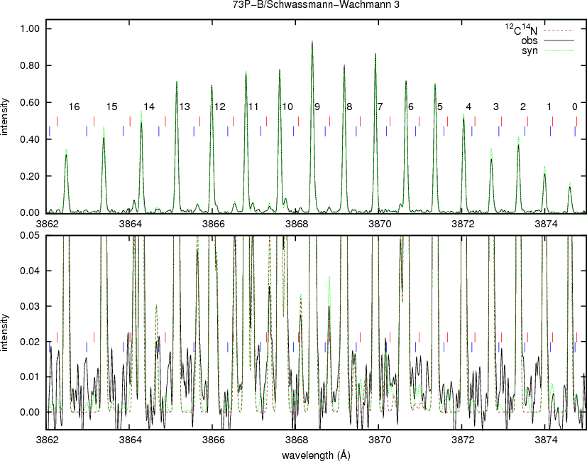 Figure C.26: Observed (2DCoudé) and synthetic (dotted) spectra of comet 73P-B/Schwassmann-Wachmann 3. |