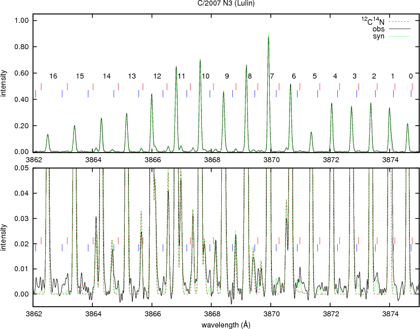 Figure C.1: Observed (2DCoudé) and synthetic (dotted) spectra of comet 122P/de Vico. In this and the following graphs, the upper (red) ticks indicate the position of the major R lines of 13C14N the lower (blue) ticks indicate the position of the major R lines of 12C15N. The corresponding quantum numbers are indicated in the upper panel midway between the strong 12C14N lines and the faint isotopic lines. The intensity scale is in relative units. |
