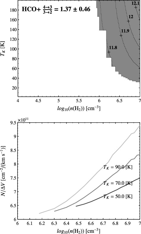 ratio, considering the uncertainties, would be consistent, in terms of density, with the HCN and HNC molecules, albeit at somewhat lower temperature. However, if we consider a larger source size of about 2'' (as shown in Sect. 4.3), the HCO+ J=3-2 line intensity will decrease, and solutions for temperatures up to 30 K (at densities of a few times