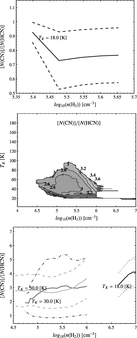 column density ratio for the temperatures and densities where the solutions found for each molecule (top panels of Figs. A.2 and A.1) overlap. The mean column density ratio ranges between 0.10 and 0.18, with errors that vary between 30% and 55% of the mean value. Note that similar ratios can be found at two different temperatures for a particular density. The bottom panel in Fig. C.1 shows the mean value, and corresponding upper and lower limits, of the