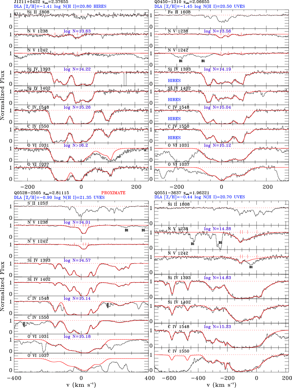 Figure A.1: Normalized high-ion absorption-line profiles for four DLAs with secure N V detections. A low-ionization line is also shown. VPFIT Voigt-profile models are included as solid red lines. In the N V panels, blends are indicated with the label ``Bl'', and tick marks show the component centers in our best-fit model. The velocity zero-point is defined by the DLA redshift. We annotate on the high-ion panels the total column density obtained by VPFIT. |