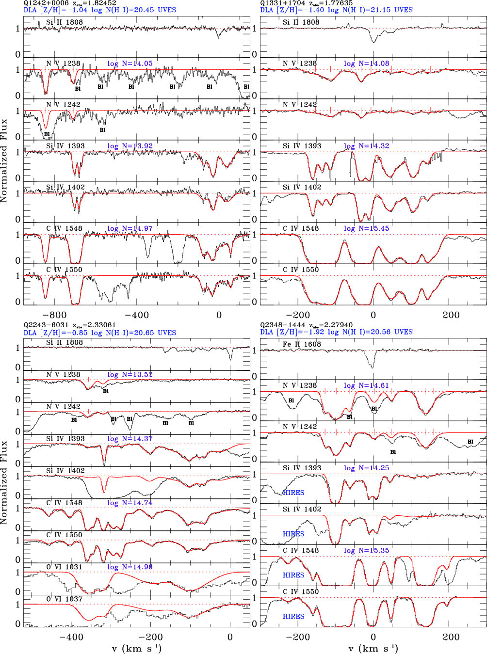 Figure A.2: Normalized high-ion absorption-line profiles for four DLAs with secure N V detections. A low-ionization line is also shown. VPFIT Voigt-profile models are included as solid red lines. In the N V panels, blends are indicated with the label ``Bl'', and tick marks show the component centers in our best-fit model. The velocity zero-point is defined by the DLA redshift. We annotate on the high-ion panels the total column density obtained by VPFIT. |