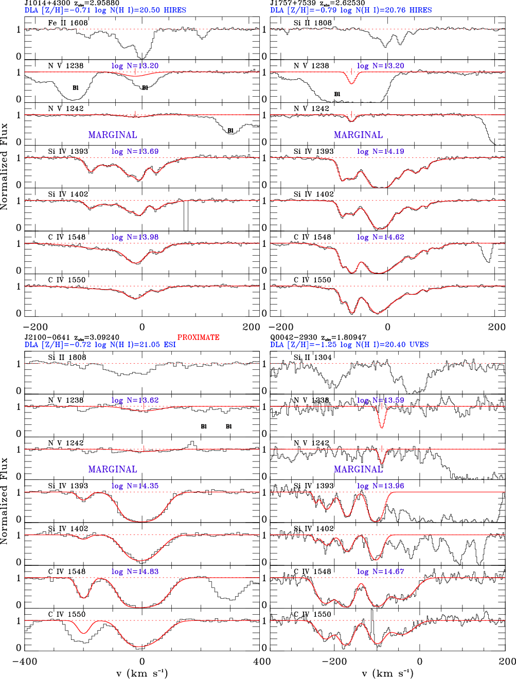 Figure A.3: High-ion absorption-line profiles for the four DLAs with marginal N V detections. A low-ionization line is also shown. VPFIT Voigt-profile models are included as solid red lines. In the N V panels, blends are indicated with the label ``Bl'', and tick marks show the component centers in our best-fit model. The velocity zero-point is defined by the DLA redshift. We annotate on the high-ion panels the total column density obtained by VPFIT. |