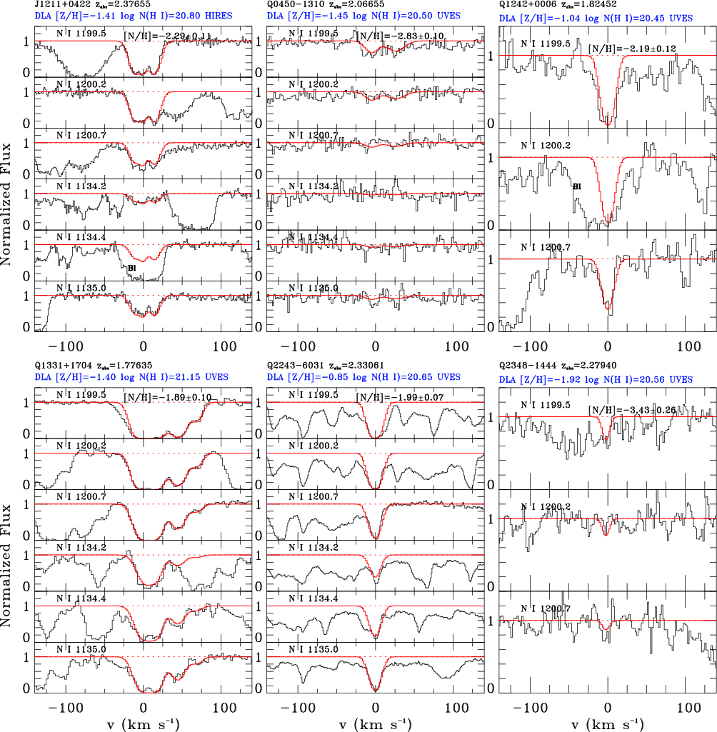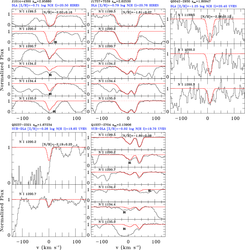 Figure A.5: Normalized N I absorption-line profiles in six DLAs with N V. VPFIT Voigt component models are included as solid red lines. Blends are identified only when they appear at the velocities of N I absorption. |