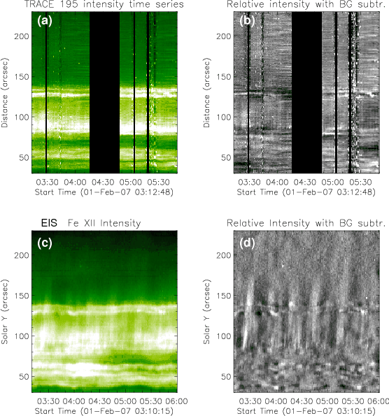 Figure A.1: Comparisons between EIS and TRACE observations. a) Constructed TRACE 195 Å time-distance image along the EIS slit. b) Same as a) but with the background subtraction, where the background is taken as the average over time at each position along the cut. c) The EIS Fe XII intensity time series. d) Same as c) but with the background subtraction. |