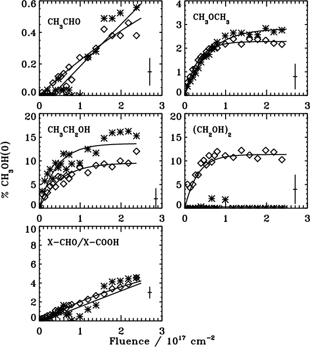 Figure A.4: The evolution of complex CH3OH photo-products with respect to UV fluence in % of the initial CH3OH ice abundance. Otherwise as Fig. A.3. |