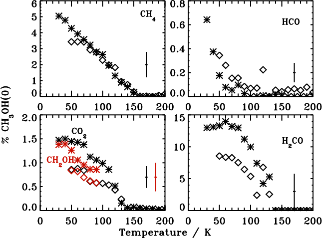 Figure B.6: The evolution of small photo-products, in % of the initial CH3OH ice abundance, with respect to temperature following irradiation of CH3OH:CH4 1:2 ice mixtures at 30 (stars) and 50 K (diamonds). The average uncertainties are indicated by the error bar to the right in each panel. |