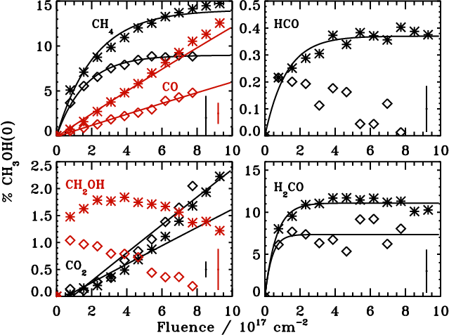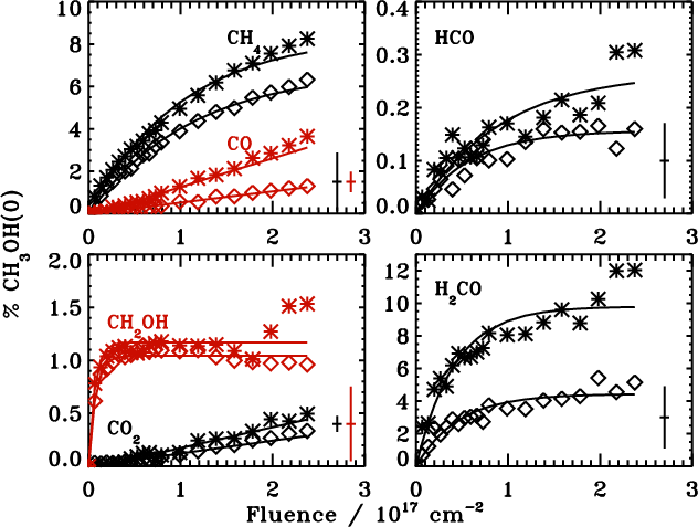 Figure B.1: The evolution of small CH3OH photo-products with respect to UV fluence in % of the initial CH3OH ice abundance in pure CH3OH irradiation experiments at 30 K (stars) and 50 K (diamonds). The average uncertainties are indicated by the error bar to the right in each panel. |
