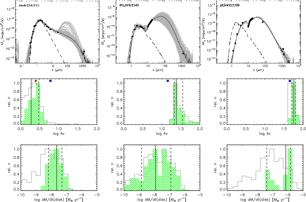 In this appendix, we describe how we constrained some stellar and circumstellar parameters of the objects in our sample by comparing their SEDs with the theoretical models of Robitaille et al. (2006). These consist of a grid of 200 000 model SEDs that include contributions from the central star, the circumstellar disk, and the envelope, parametrized with 14 parameters. The models that best approximate the observed SEDs were found with the aid of the Web-based tool presented by Robitaille et al. (2007). As stated by Robitaille et al. (2007), and in accord with basic principles, this method does not allow the simultaneous determination of all 14 physical parameters, since the SEDs are often defined by less than 14 independent fluxes. However, depending on the available fluxes, some of the parameters can be constrained more narrowly than others. We are interested here, in particular, in obtaining the range of values compatible with the observed SEDs for: i) the extinction toward our objects; ii) their disk accretion rates.