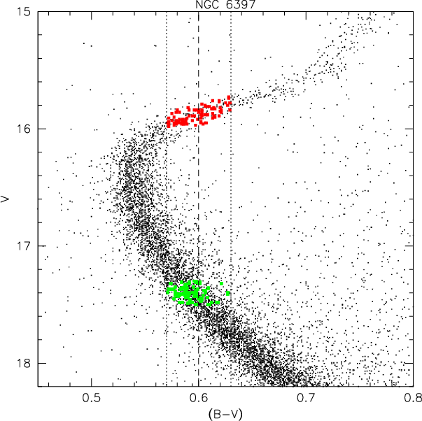 Figure 3: Colour-magnitude diagram of the cluster NGC 6397. The stars studied in this work are depicted in small filled squares. |