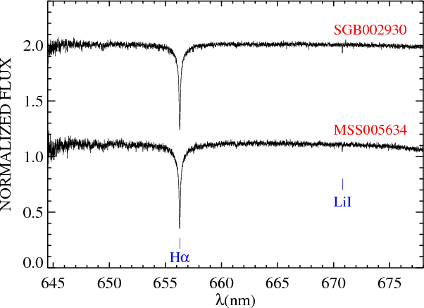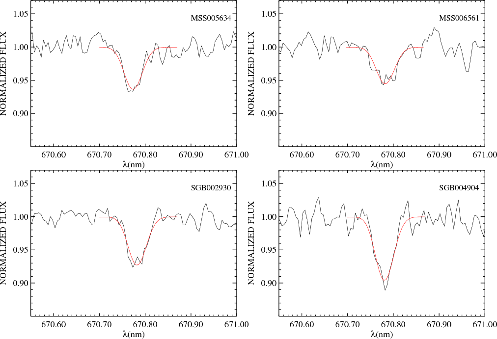 Figure 10: Observed spectra of two dwarf stars, MSS005634 ( top-left panel, S/N= 102, EW(Li) = 32.21 mÅ) and MSS006561 ( top-right panel, S/N=71, EW(Li) = 27.97 mÅ) and two subgiant stars, SGB002930 ( bottom-left panel, S/N=111, EW(Li) = 36.83 mÅ) and SGB004904 ( bottom-left panel, S/N =68, EW(Li) = 48.52 mÅ), showing the fit of the Li line with a synthetic profile. |
