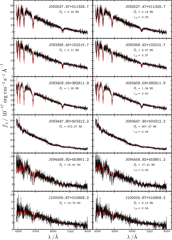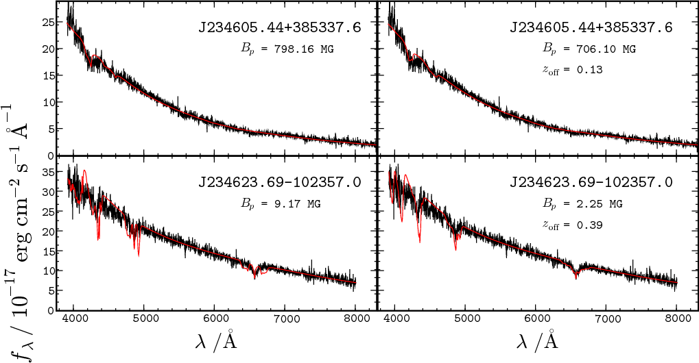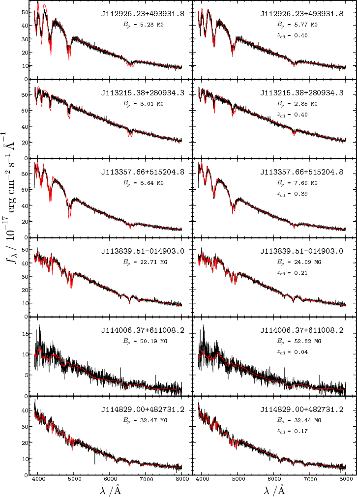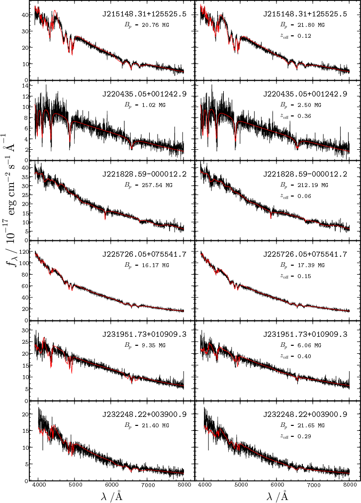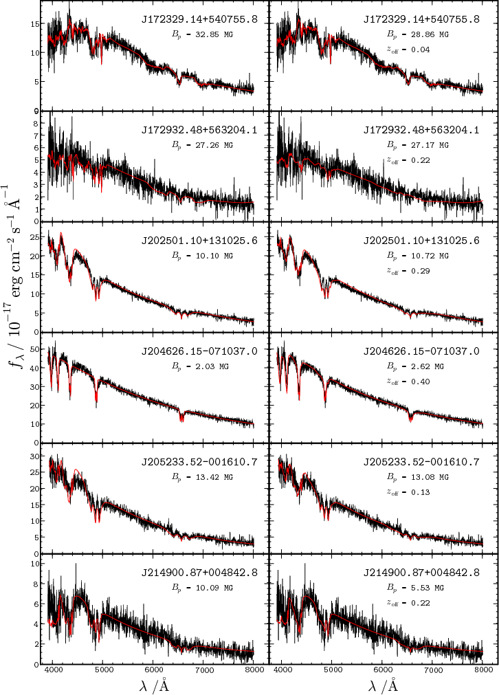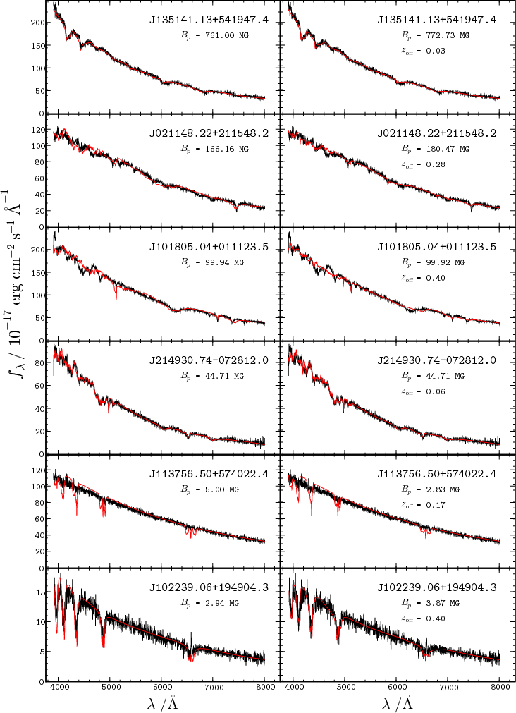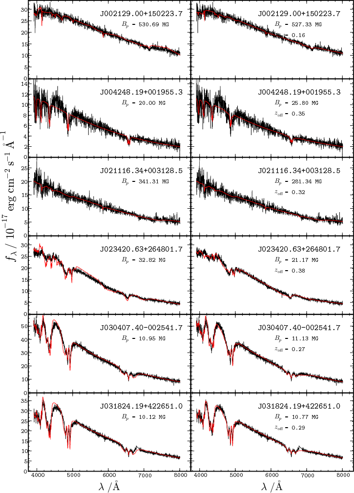 Table 3: Model fits with centered dipole and offset dipole models with comparison to literature values. The columns indicate the SDSS name of the object; the plate, Modified Julian Date and fiber ids of the observations; the dipole magnetic field strength of the centered dipole, the inclination with respect to the line of sight of the centered dipole, the dipole magnetic field strength of the offset dipole, the inclination with respect to the line of sight of the offset dipole, the offset along the axis of the magnetic field in terms of the stellar radius, and finally comments indicate the model parameters from the literature (i.e. Vanlandingham et al. 2005; Schmidt et al. 2003; Gänsicke et al. 2002)