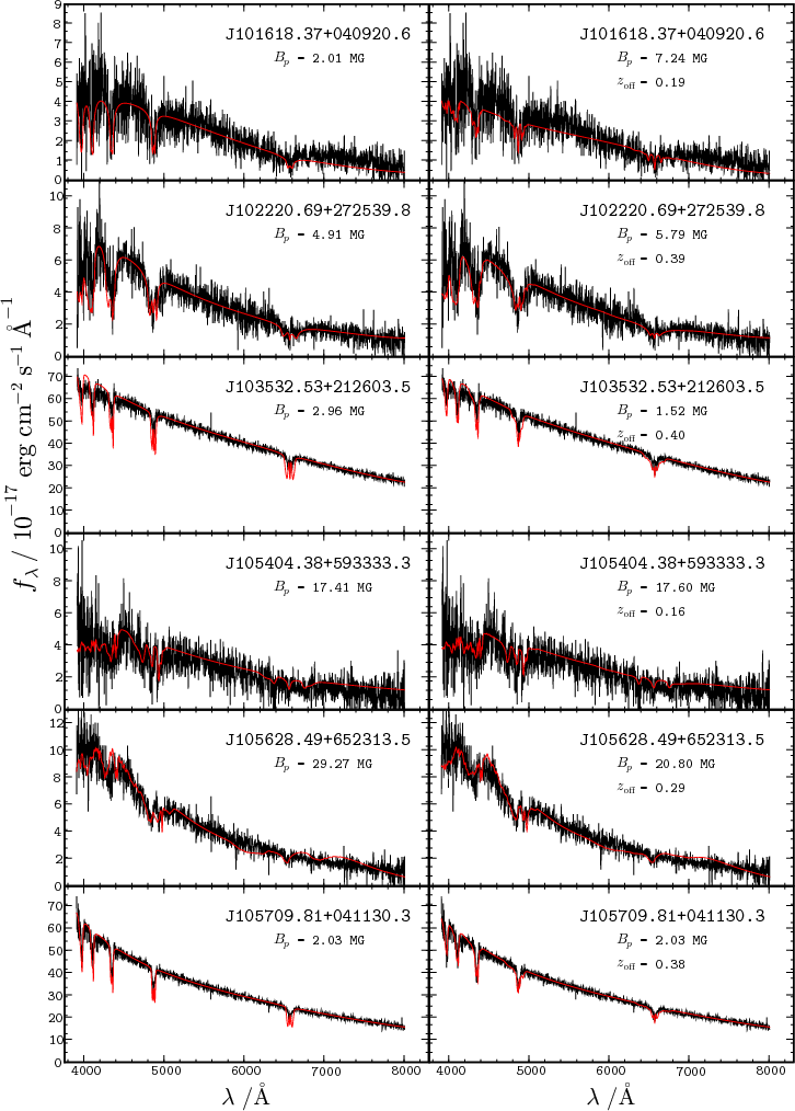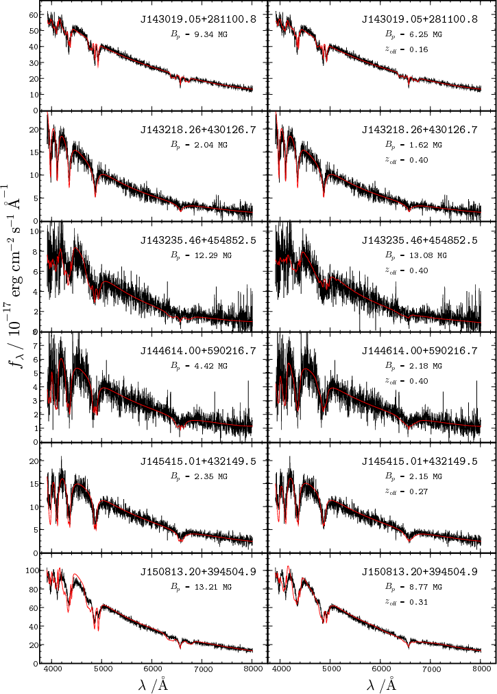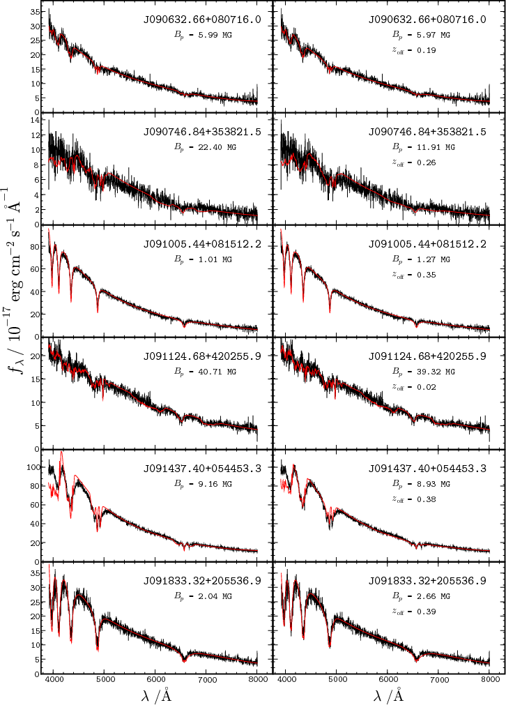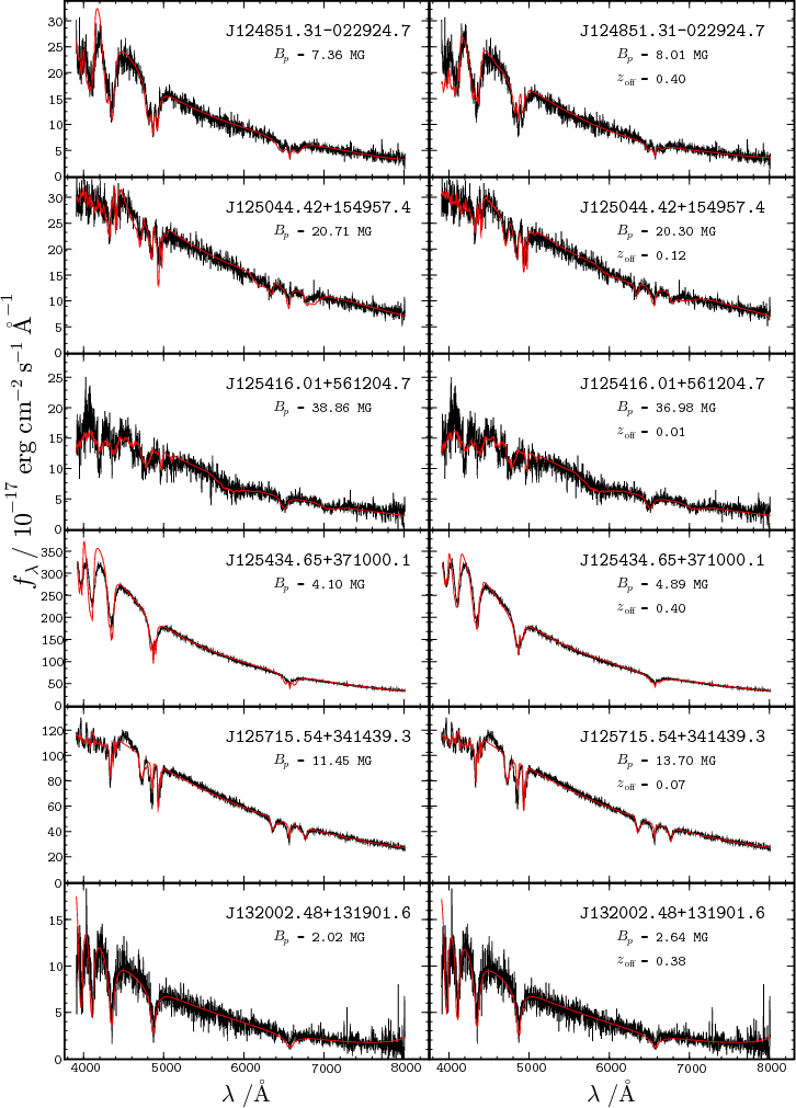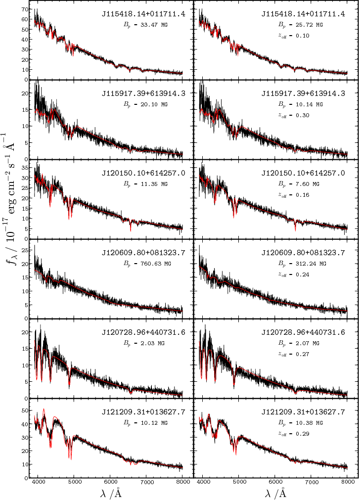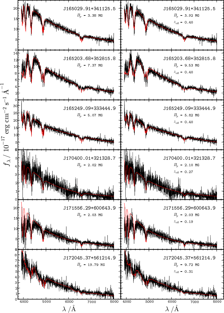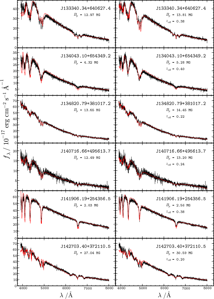 Table 3: Model fits with centered dipole and offset dipole models with comparison to literature values. The columns indicate the SDSS name of the object; the plate, Modified Julian Date and fiber ids of the observations; the dipole magnetic field strength of the centered dipole, the inclination with respect to the line of sight of the centered dipole, the dipole magnetic field strength of the offset dipole, the inclination with respect to the line of sight of the offset dipole, the offset along the axis of the magnetic field in terms of the stellar radius, and finally comments indicate the model parameters from the literature (i.e. Vanlandingham et al. 2005; Schmidt et al. 2003; Gänsicke et al. 2002)