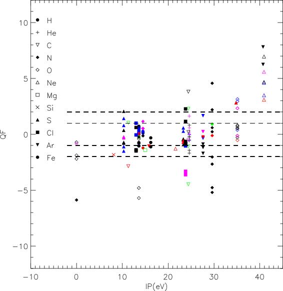 The collision strengths for Cl++ used in Cloudy are taken from Wilson & Bell (2002). Note that Cloudy takes into account the correction by a factor of 10 for the collision strength for 1D2-1S0 as discussed in Keenan et al. (2003). We test these values against the previous values from Krueger & Czyzak (1970) and found that these latest are in closer agreement with the observations. On one side, the values for [Cl II] and [Cl III] are fitted when using values from Krueger & Czyzak, while it is impossible to fit both ions with the same Cl abundance when using collision strengths from Wilson & Bell. In this case, the [Cl II] lines are predicted to be too high, while the [Cl III] lines are fitted well.