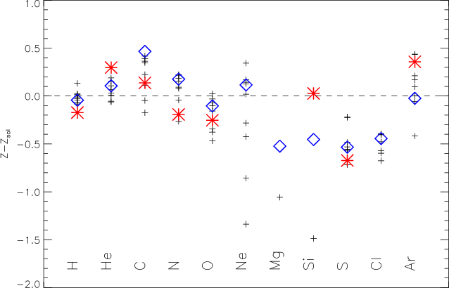 Figure D.8: Nebular abundances by mass from the literature (small crosses, same as in Table 2) and from the adopted model (large stars represent the stellar abundance, and large diamond the nebular abundances). Units are in log(abundance by number) relative to the solar values from Asplund et al. (2005). |