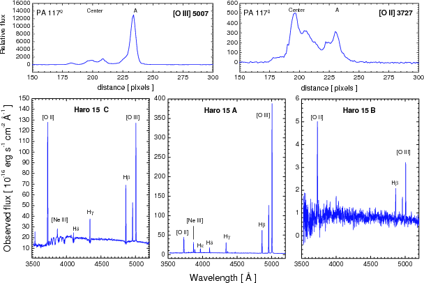 Lower panels: zoom of the spectra of regions C ( center), A, and B of Haro 15 ( bottom). Fluxes are not corrected for