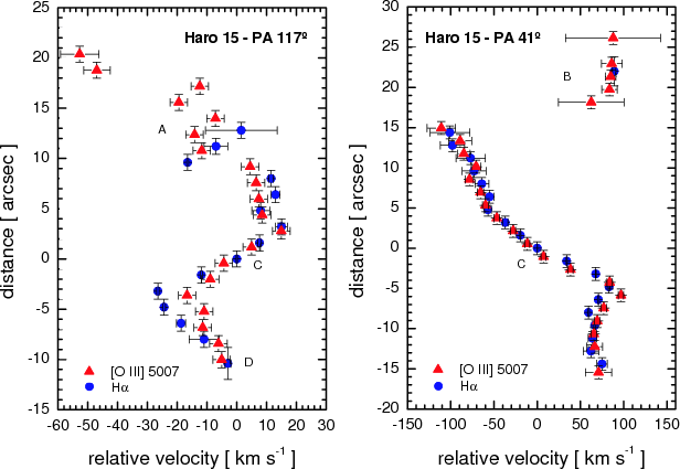 Position-velocity diagrams for the two slit positions observed in Haro 15. Both the H |