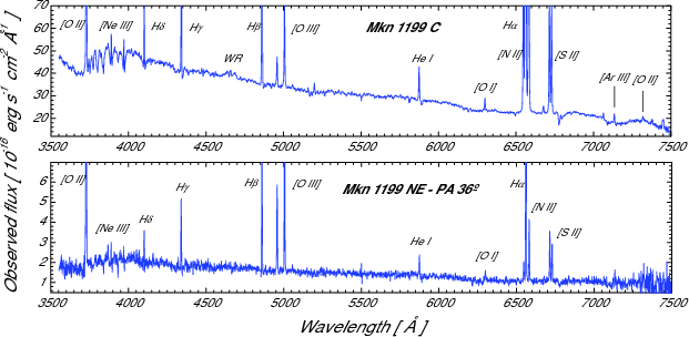 | Figure 4: IDS INT spectra for the center of Mkn 1199 and the dwarf companion galaxy at its NE. Fluxes are not corrected for reddening. The most important emission lines have been labeled. See Fig. 5 in Paper I for the identification of the regions. |