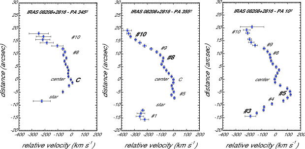 Position-velocity diagrams for the three slit positions observed of IRAS 08208+2816 using the [O III] |