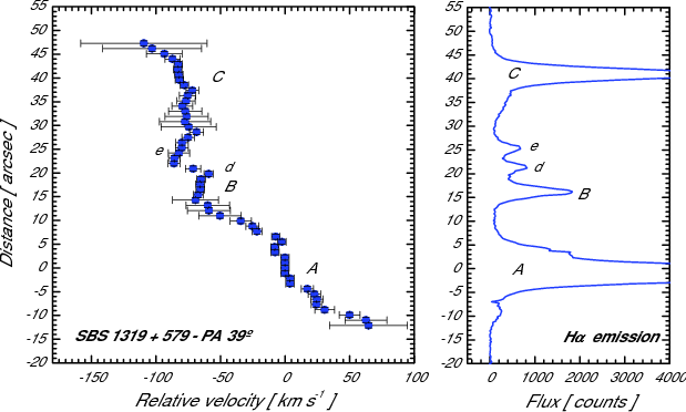 Position-velocity diagram for the slit position observed in SBS 1319+579 using the H |