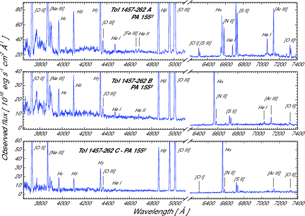 Figure 32: ALFOSC 2.56 m NOT spectra of the regions analyzed in Tol 1457-262. Fluxes are not corrected for reddening. The most important emission lines have been labeled. See Fig. 31 in Paper I for identification of the regions. |
