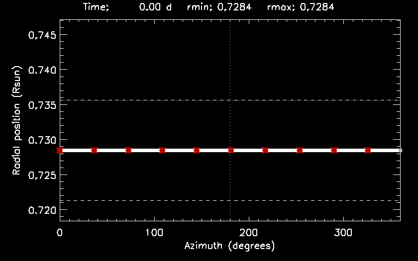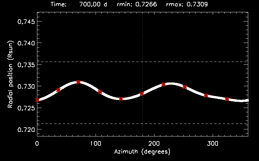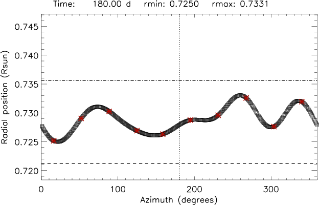 The animation files TF60.gif and TF180.gif show the evolution of a flux tube subject to a radial downflow with a duration of 60 and 120 days, respectively, until t=300 days (Sect. 3.2.2). Two snapshots are shown in Figs. C.2 and C.3, corresponding to the time when the downflow ceases in each case, i.e., at t=60 d and t=180 d. Note that for the longer-duration flow, the flux tube is radially more disturbed when the action of the downflow is finished.