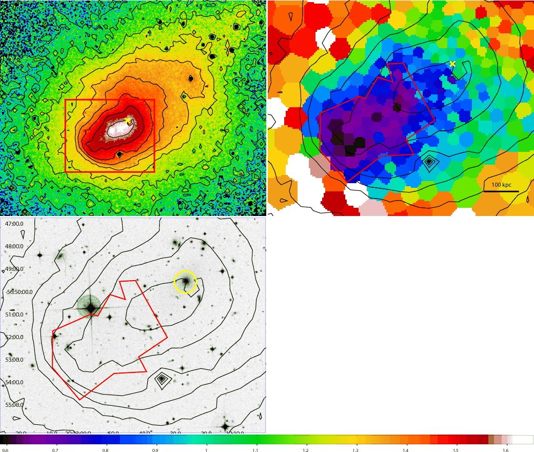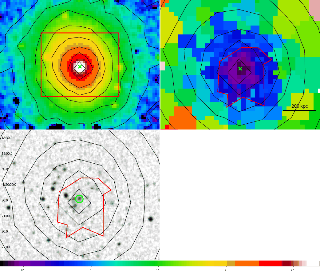 Figure B.10: Abell 3571. Upper left panel: X-ray flux image. Upper right panel: pseudo-entropy ratio map (zoom), with X-ray contours overlaid. Lower left panel: optical image (zoom), with X-ray contours overlaid. The red box in the first panel marks the region zoomed in in the other two panels. The red polygon in the other two panels is the contour of the ``CC-remnant'', i.e. it marks the bins where the pseudo-entropy ratio is <0.8. The green circle ( lower left) and ``X'' mark the position of the BCG. The scale refers to the pseudo-entropy ratio map. |