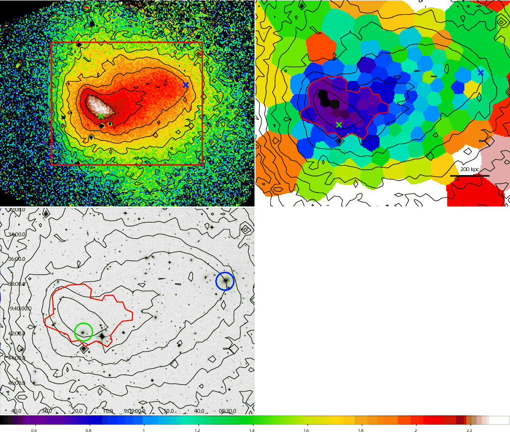 Figure B.8: Abell 754. Upper left panel: X-ray flux image. Upper right panel: pseudo-entropy ratio map (zoom), with X-ray contours overlaid. Lower left panel: optical image (zoom), with X-ray contours overlaid. The red box in the first panel marks the region zoomed in in the other two panels. The red polygon in the upper right panel is the contour of the ``CC-remnant'', i.e. it marks the bins where the pseudo-entropy ratio is <0.8. The blue circle and X show the position of the BCG, while the green circle and X show the elliptical galaxy 2MASSX J09091923-0941591. The scale refers to the pseudo-entropy ratio map. |