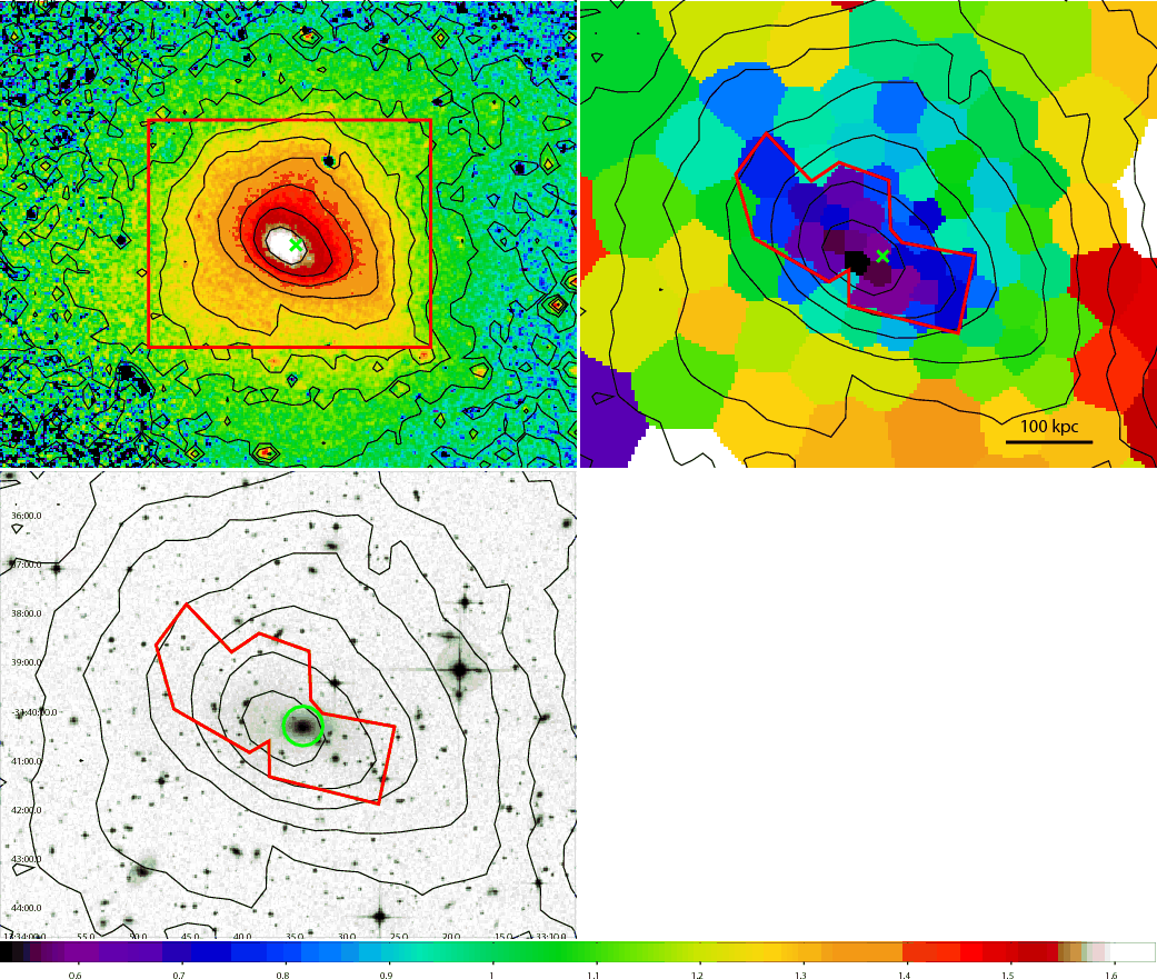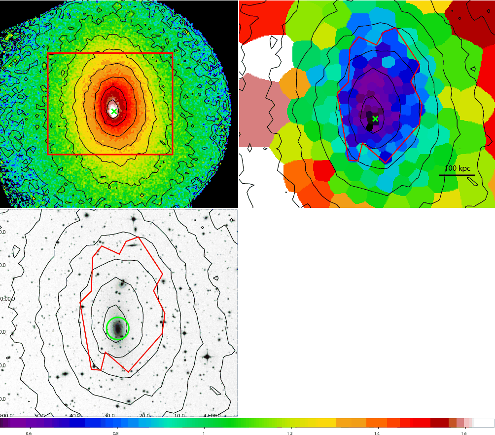 Figure B.1: Abell 1650. Upper left panel: X-ray flux image. Upper right panel: pseudo-entropy ratio map (zoom), with X-ray contours overlaid. Lower left panel: optical image (zoom), with X-ray contours overlaid. The red box in the first panel marks the region zoomed in in the other two panels. The red polygon in the other two panels is the contour of the ``CC-remnant'', i.e. it marks the bins where the pseudo-entropy ratio is <0.8. The green circle ( lower left) and ``X'' mark the position of the BCG. The scale refers to the pseudo-entropy ratio map. |