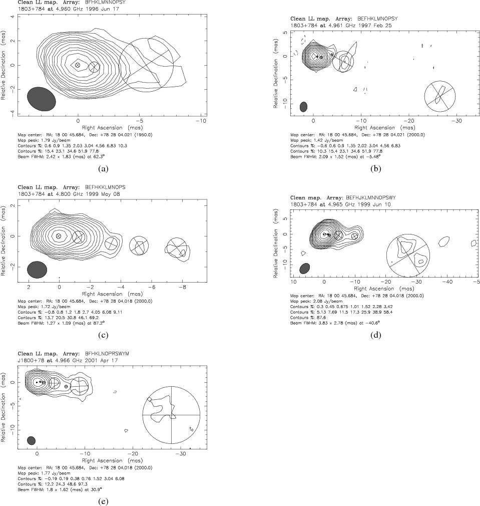 Table 1: Circular Gaussian model-fit results for S5 1803+784. The columns list the epoch of observation, the jet-component identification, the flux density, the radial distance of the component center from the core, the position angle of the center of the component, the FWHM major axis, and the chi-square of the fit.