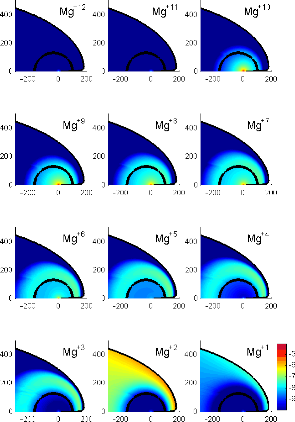 Figure 8: Heliospheric maps of density distributions (ions/cm3) of magnesium ions in various ionization states under isotropization condition (density coding as in Fig. 2). (Scale in AU on both axes.) |