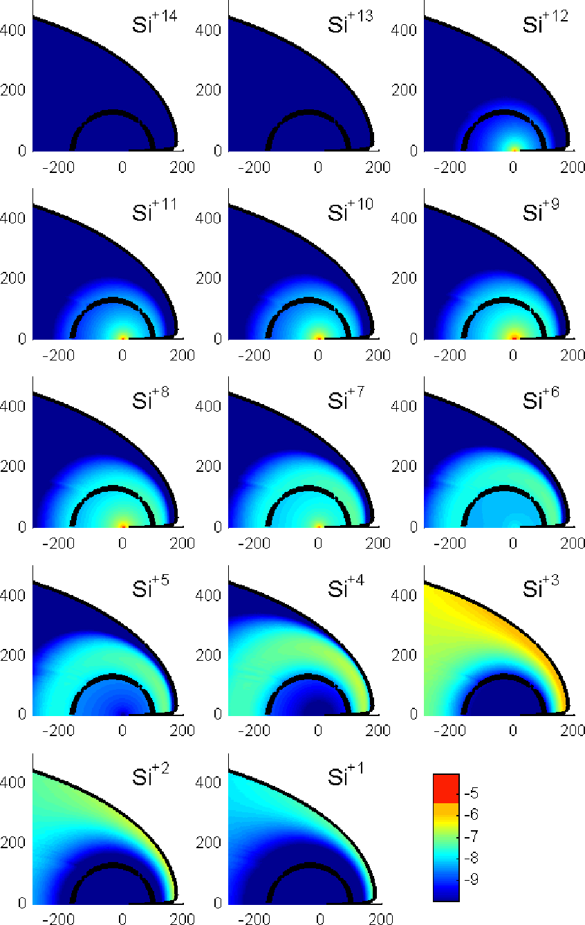 Figure 9: Heliospheric maps of density distributions (ions/cm3) of silicon ions in various ionization states under isotropization condition (density coding as in Fig. 2). (Scale in AU on both axes.) |