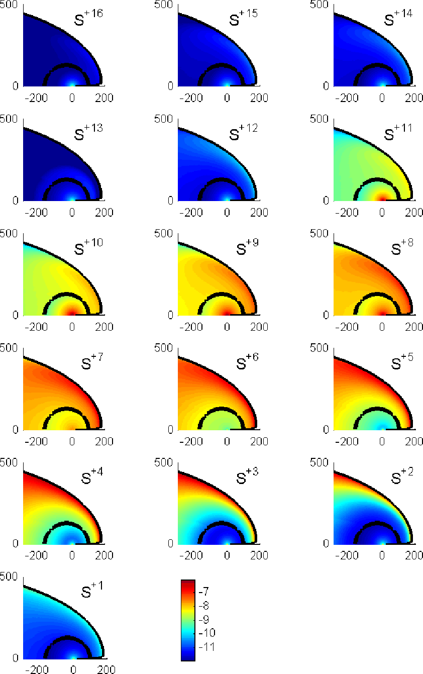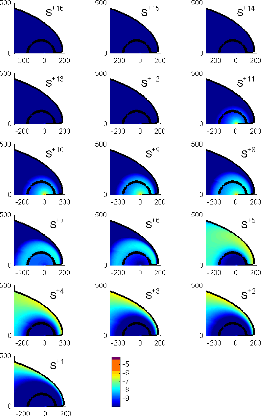 Figure 10: Heliospheric maps of density distributions (ions/cm3) of sulfur ions in various ionization states under isotropization condition (density coding as in Fig. 2). (Scale in AU on both axes.) |
