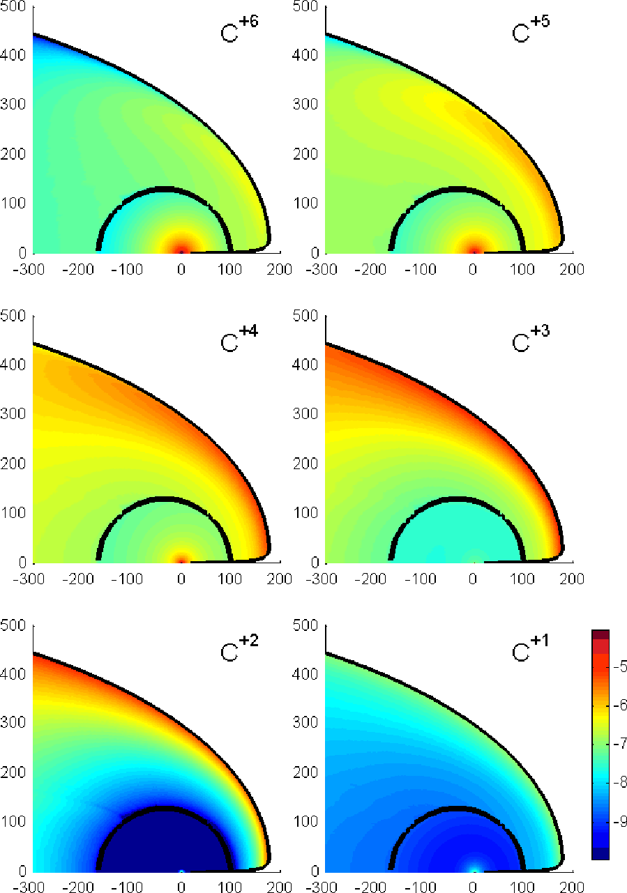 Figure 16: Heliospheric maps of density distributions (ions/cm3) of carbon ions in various ionization states of carbon for post-shock heavy ion random speed in the heliosheath equal to 170 km s-1 (density coding as in Fig. 2). (Scale in AU on both axes.) |